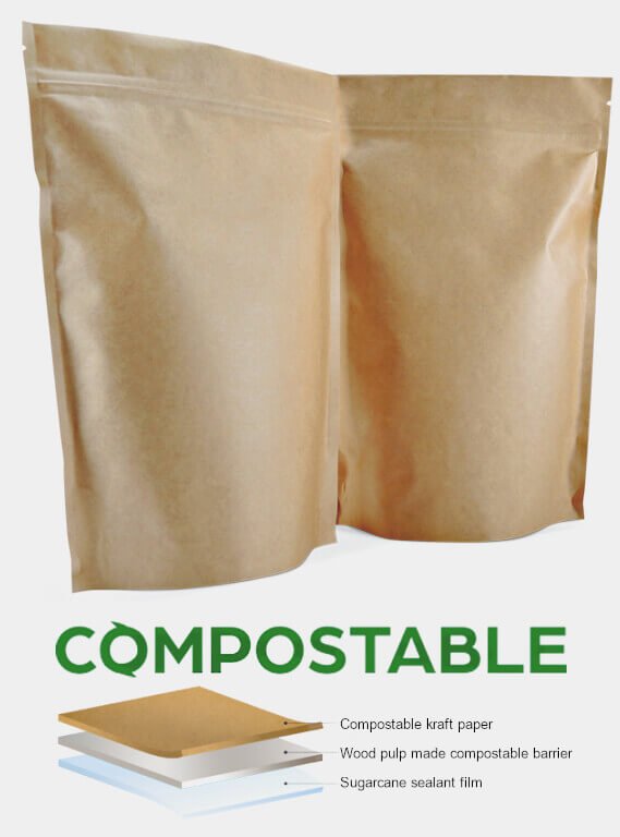 100% Compostable Stand-Up Pouches: For our coffee beans and grounds, we use 100% compostable stand-up pouches made from natural brown kraft. These pouches, including the innovative Swiss-made valve, are fully compostable. The valve, made from EcoVio by BASF, ensures the freshness of our coffee while being environmentally friendly. These pouches are not only aesthetically pleasing but also align with our mission to reduce plastic waste and support a circular economy.